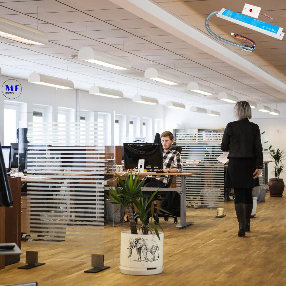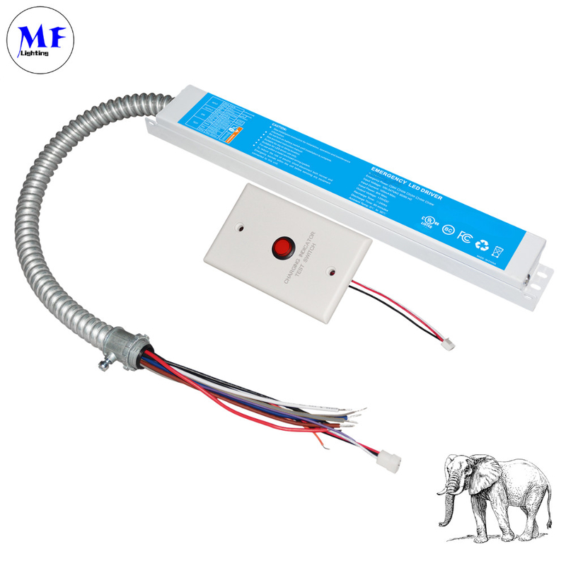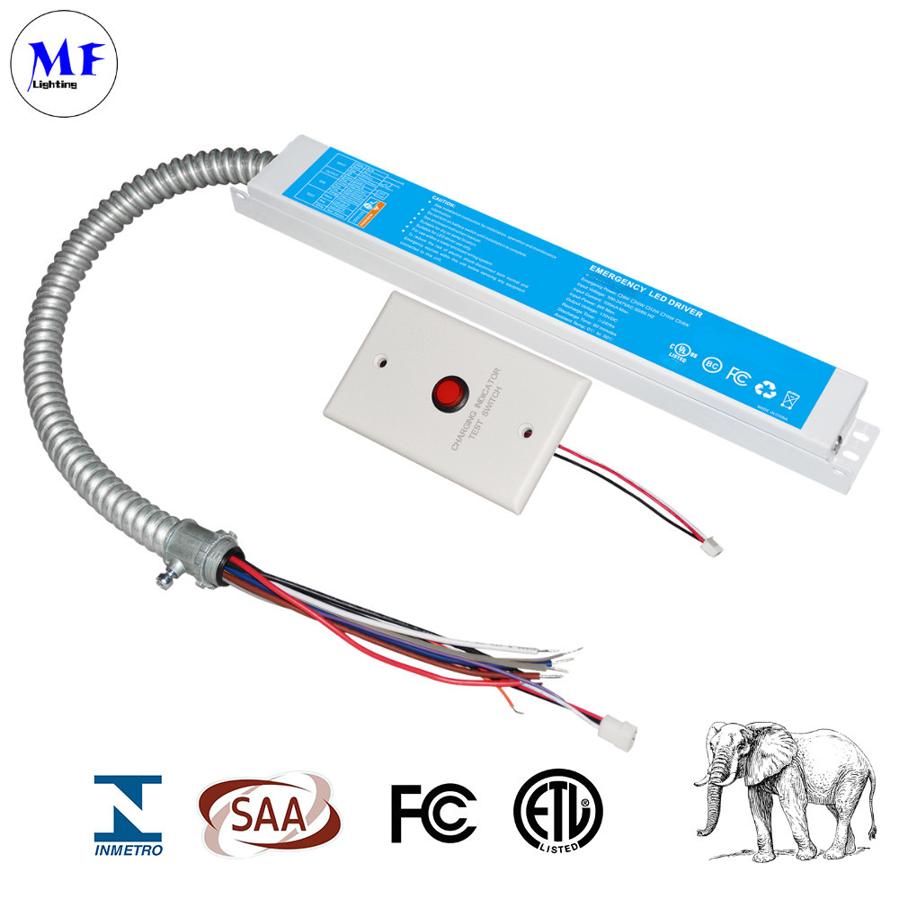The MF-EM-xxW-170 LED Emergency Driver is a reliable and versatile backup power solution designed to maintain lighting during AC power outages. Compliant with UL924 and CSA C22.2 NO.141 standards, it delivers emergency power ranging from 15W to 40W with a stable 170V DC output, powered by long-lasting Li-ion batteries that provide 90 minutes of runtime. The driver features a self-testing function, performing automatic 30-second monthly tests and full annual discharge tests to ensure system reliability. It supports multiple control options, including 0-10V dimming, TRIAC dimmers, and sensor-based (DC12V/AC120V) operation, making it adaptable for various lighting setups. With a wide input voltage range (100-347V AC), over-temperature protection, and a 5-year warranty, it is built for durability and safety. Compact in design (12.01" × 2.36" × 1.57"), it is ideal for commercial, industrial, and residential applications where emergency lighting is essential.